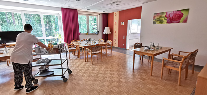 Gekocht wird in eigener Küche, wo neben regional typischen Speisen auch täglich eine Schonkost zubereitet wird. Im Speisesaal oder bei schönem Wetter, auch im angrenzenden Garten, richten wir gemeinsame Feste für unsere Bewohner aus.